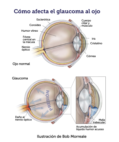 La presión intraocular, aquella presión del líquido dentro del ojo, se mantiene en niveles normales cuando parte del humor acuoso circulante (líquido producido por el ojo) puede salir del ojo a través de su vía de drenaje natural. Luego, el humor acuoso fluye a través de un tejido esponjoso en la parte anterior o frontal del ojo (la malla trabecular) hacia un canal de drenaje. En las formas más comunes de glaucoma, el líquido no puede fluir de manera eficiente a través de la malla trabecular, lo que provoca un aumento de la presión intraocular. Este aumento de la presión se asocia con daños en el nervio óptico, lo que lleva a la pérdida de la visión.