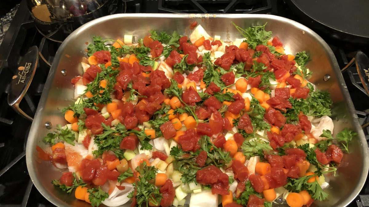 - Toss onions, cherry tomatoes and green beans in sauce. Remove vegetables from bowl and place on a large sheet pan. Keep remaining sauce.